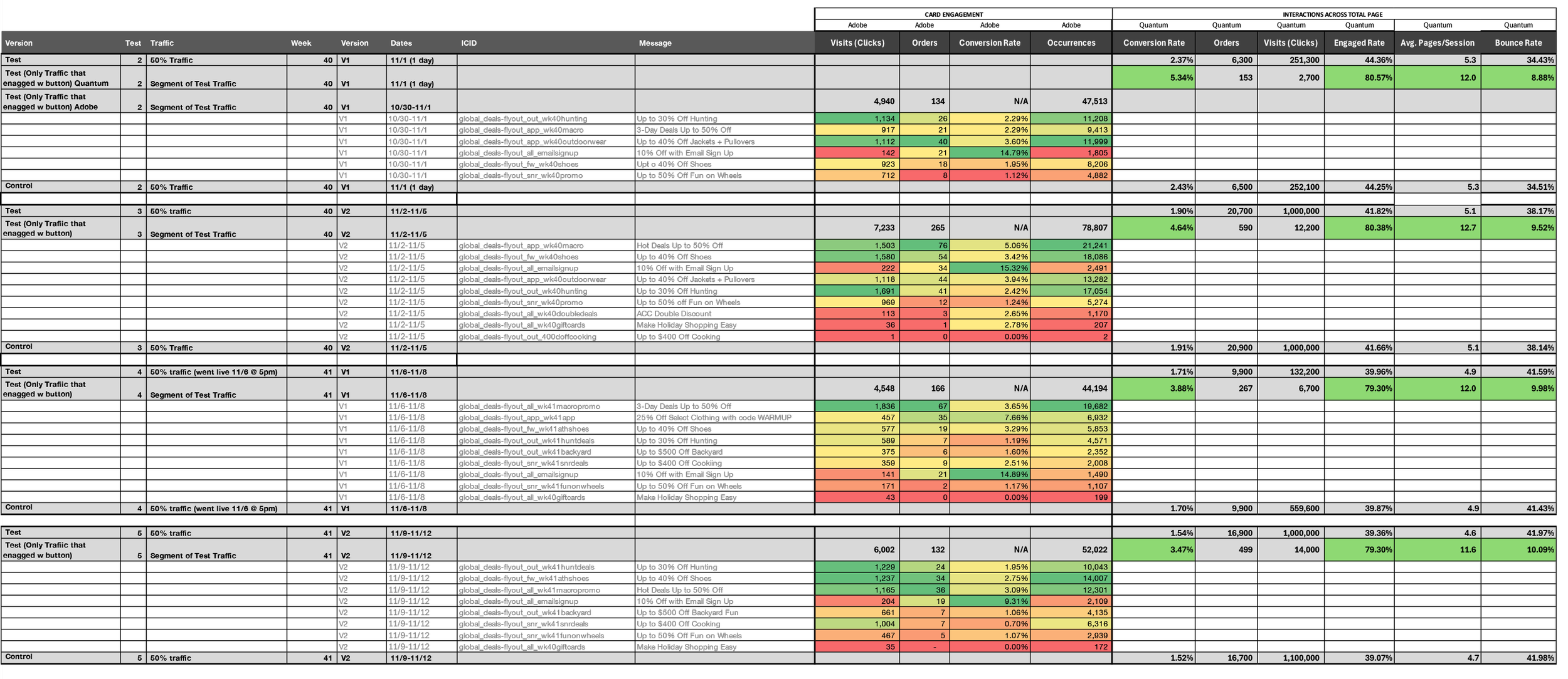 Starting the first week of November, we split traffic 50/50 looking at key metrics such as visits and page views (engagement), conversion rate, bounce rate, and AOV. We ran this 50/50 split for 2 weeks, with 4 different versions to account for changing promotional materials.